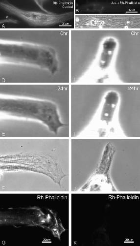 Figure 1. Masking of preexistent F-actin structures by jasplakinolide pretreatment. (AâC) Competition between jasplakinolide and phalloidin for F-actin binding. (A) Rh-phalloidin labeling of myofibrils. (B and C) Pretreating the culture with 1 μM jasplakinolide followed by Rh-phalloidin blocked myofibril labeling, thus showing that these two toxins compete for F-actin binding. (DâG) Jasplakinolide pretreatment does not abolish new F-actin assembly in motile muscle cells. This cell was treated with 10 μM jasplakinolide for 3 h and rinsed with drug-free medium. The lamellipodia developed after jasplakinolide removal (compare D and E) exhibited F-actin assembly as shown by Rh-phalloidin labeling (G) at the end of the 24-h period. D and E are live images and F and G are fixed cell images. Phaseâcontrast of the cell at 24 h is shown in F. (HâK) In contrast to motile cells, this nonmotile cell showed no new F-actin assembly after jasplakinolide pretreatment. H and I are live images and J and K are fixed cell images.
