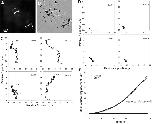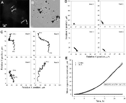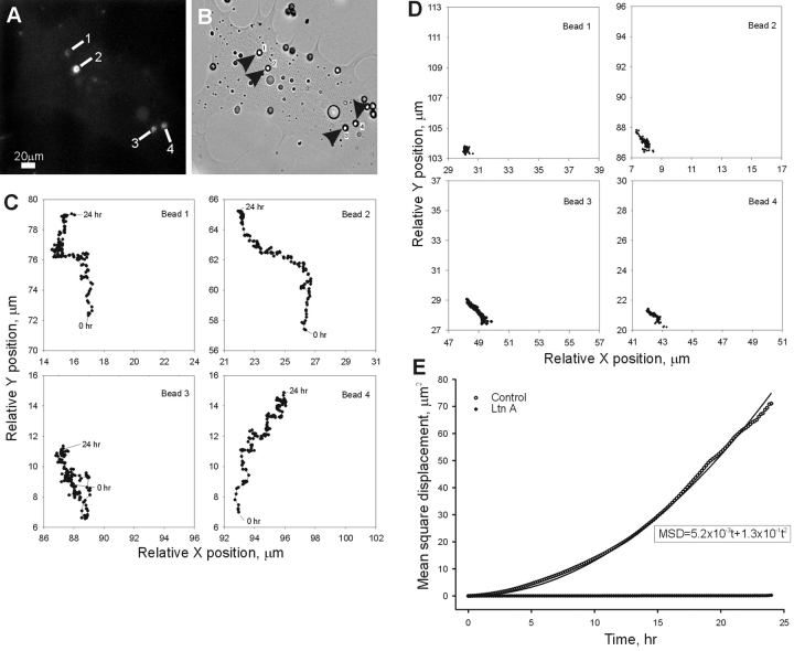 Figure 6. Trajectories of bead/AChR movement. (A and B) Four clusters and their associated beads were followed during a 24-h period. This image was taken at the end of the recording. The trajectories of these four beads are shown in C with the beginning and end points indicated. (D) Except for slow diffusional drift, the bead movement was abolished after Ltn A (1 μM) treatment. (E) MSD plotted against time. The linear slope of Ltn A data provides an estimate of the diffusion coefficient of the bead/AChR complex in the plane of the membrane. The solid curve is a regression fit of the control data using the equation described. From this, an actin-driven bead/cluster movement velocity of 0.1 nm/s is calculated. The R coefficient of the regression is 0.9985.