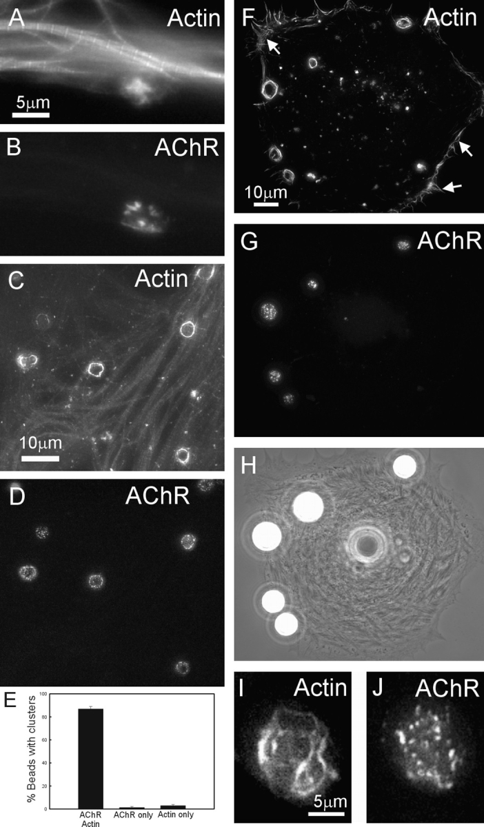 Figure 2. F-actin assembly at AChR clusters induced by HB-GAM beads. A, C, F, and I, Rh-phalloidin labeling; B, D, G, and J, OG-BTX labeling. (A and B) F-actin at an AChR hot spot in a thin lamella region. Phalloidin-labeled myofibrils and F-actin at AChR cluster. (C, D, and F–J) Jasplakinolide pretreatment to mask preexisting F-actin before bead stimulation. The beads induced spatially discrete actin polymerization and AChR clustering as shown in two examples (C and D and F–H). In addition to sites of bead–muscle contacts, new F-actin assembly was also seen at filopodia and lamellipodia at the cell periphery (F, arrows). H is a phase image of the cell shown in F and G. At higher magnification (I and J), the punctate and circumferential pattern of new F-actin can be seen. The F-actin and AChR patterns are not congruent. (E) Quantification of F-actin and AChR induction by beads. The majority of beads induced both specializations (correlation coefficient 0.987). Data from 40 cells are pooled.