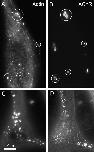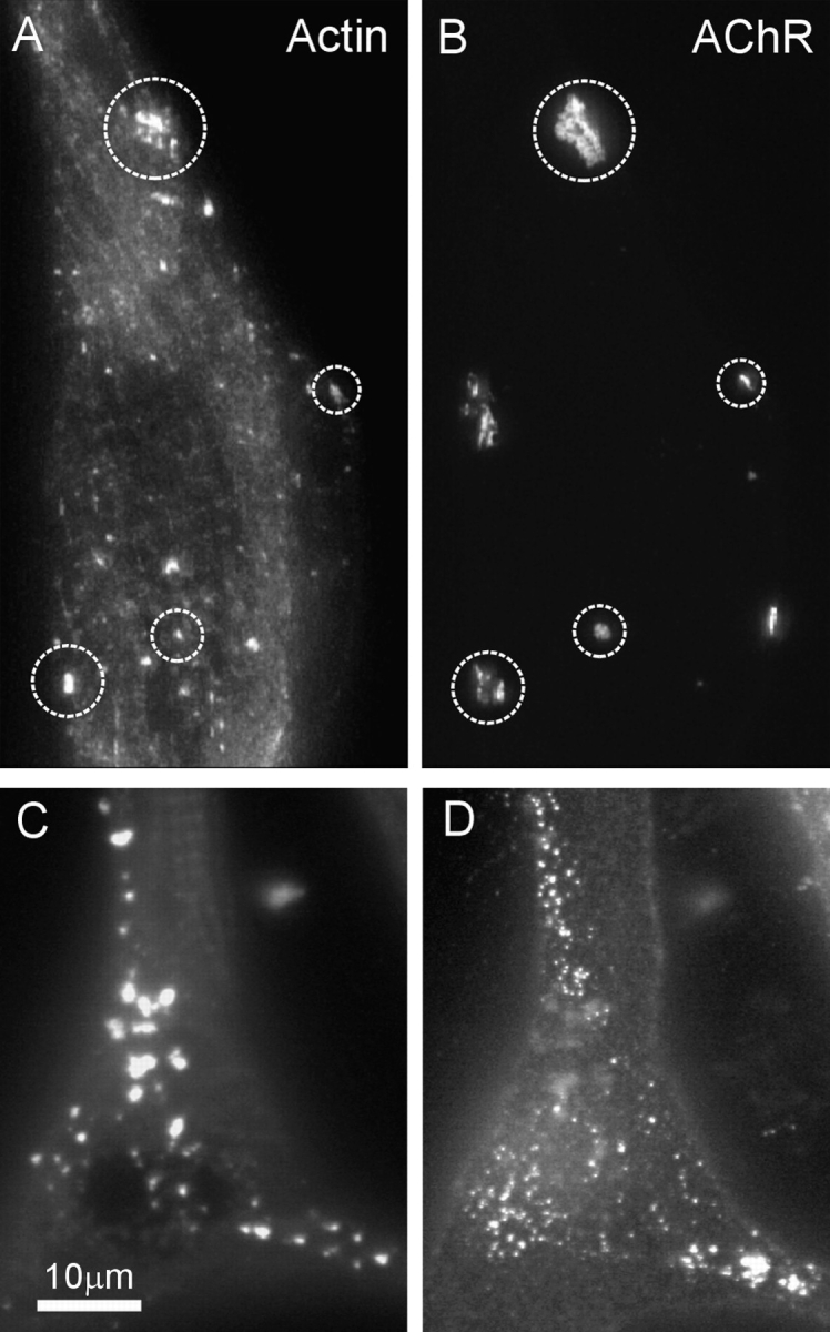 Figure 3. F-actin assembly induced by agrin after jasplakinolide pretreatment. Unlike beads, agrin induced a more diffuse F-actin assembly which paralleled the scattered AChR clustering pattern. (A and B) Examples of colocalization of agrin-induced F-actin and AChR patches (circles). However, the patterns of these two specializations are different despite their colocalization. (C and D) An example of the general lack of precise registration in these two specializations.