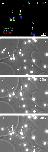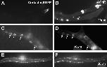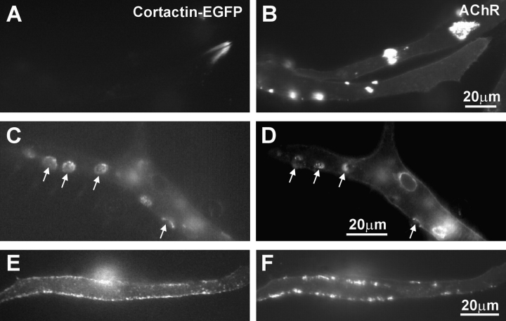 Figure 4. Cortactin-EGFP expression. (A and B) In unstimulated cells, cortactin was concentrated at membrane lamellae and often showed no colocalized with AChR hot spots. (C and D) Bead-induced AChR clusters were marked by cortactin localization. (E and F) Agrin induced association of cortactin with membrane areas encompassing AChR clusters.