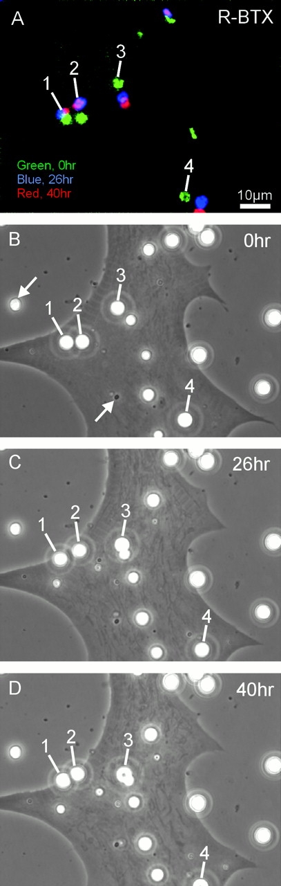 Figure 5. Movement of bead-induced AChR clusters. One day after cluster formation induced by 5-μm beads, the clusters were followed for an additional 40 h. (A) Superimposed time-lapse image of the positions of four AChR clusters. (B–D) Corresponding phase–contrast images to show bead positions. Arrows in B point to two reference markers which showed little displacement during the 40-h period.