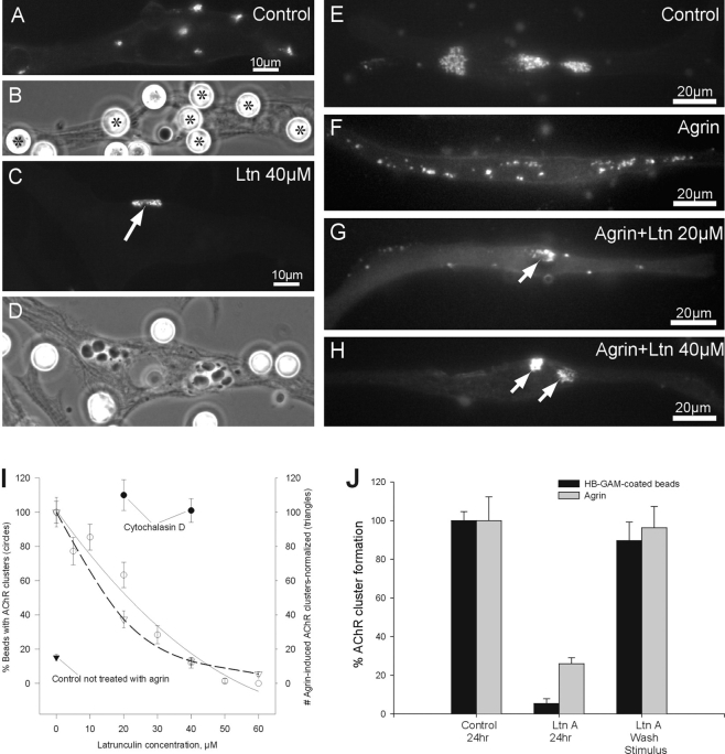 Figure 8. Inhibition of AChR clustering by Ltn A. (A–D) Effect on bead-induced cluster formation. (A and B) In the untreated culture, clusters were induced by the majority of beads. Asterisks in B indicate cluster-positive beads. At the same time, preexistent AChR hot spots were dispersed as shown by the lack of non-bead-associated clusters. (C and D) Ltn A at 40 μM completely abolished the effect of beads in inducing new clusters, whereas preexisting hot spots were retained (C, arrow). (E–H) Effect on agrin-induced cluster formation. Control culture exhibited AChR hot spots (E) that generally were much larger than agrin-induced punctate clusters (F). Ltn A blocked the effect of agrin in a dose-dependent manner (G and H). Hot spots (arrows) were retained in the presence of Ltn A. (I) Quantification of the Ltn A effect. Cytochalasin D at comparable concentrations was ineffective in inhibiting cluster formation (only bead data shown). (J) Reversal of the Ltn A effect. While Ltn A inhibited both bead and agrin-induced AChR clustering (middle bars), cells recovered from this blockage and responded to these stimuli to the same level as control cells following its removal (right bars).