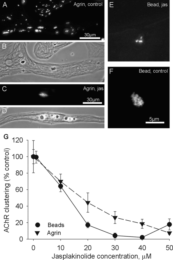Figure 9. Inhibition of AChR clustering by jasplakinolide. (A–D) Agrin-induced cluster formation was inhibited by jasplakinolide, but the hot spot was retained. (E and F) Bead-induced clustering was also inhibited. Clusters that formed in the presence of jasplakinolide (50 μM) were much smaller than control clusters. (G) Quantification of the inhibitory effect.