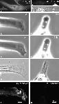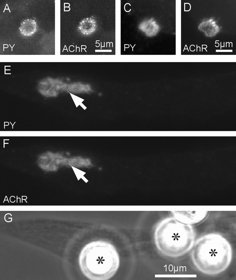 Figure 10. Disruption of PY accumulation by Ltn A. (A–D) Two examples of PY accumulation at HB-GAM bead-induced AChR clusters. (E–G) Ltn A (50 μM) treatment abolished AChR clustering (F) and PY accumulation (E) at bead–muscle contacts (G, asterisks), but left both AChRs and PY intact at preexisting hot spots (arrows).