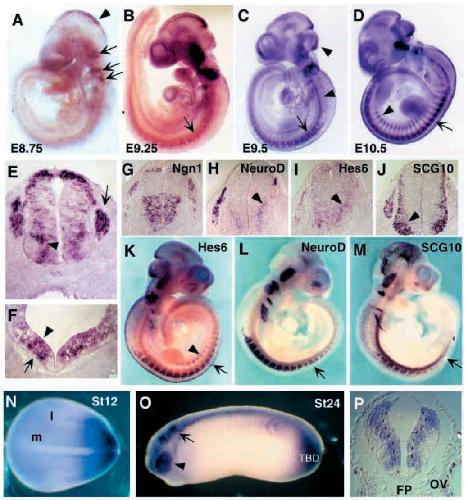 levels of Hes6 expression are detected during secondary neurogenesis in the brain (arrow) and eye (arrowhead). Note also the expression of Hes6 in