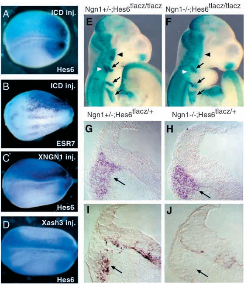 Esr7 but not that of Hes6. (E-J) Requirement of Ngn1 for Hes6