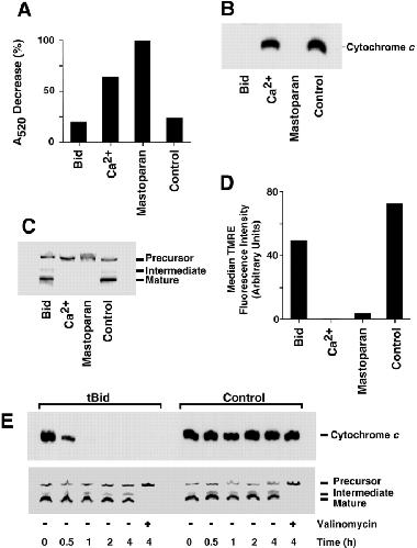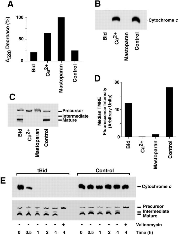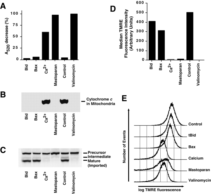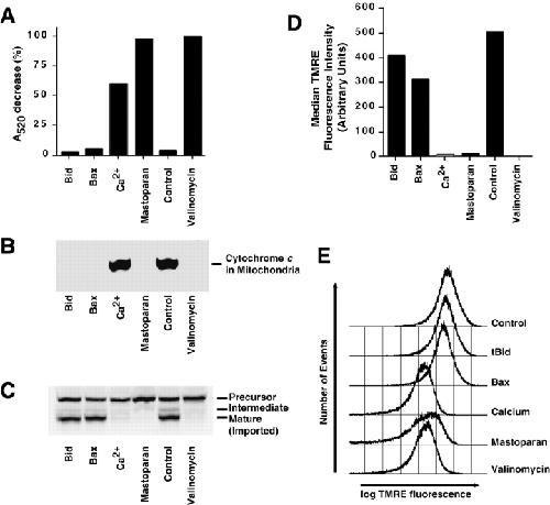 Figure 2. Bid-induced cytochrome c release does not depend on mitochondrial PT. Mitochondria (0.3 mg/ml as protein) were incubated in PT buffer, with the addition (as indicated) of 10 μg/ml tBid, 50 μg/ml Bax, 1 mM CaCl2, 20 μg/ml mastoparan, or 1 μM valinomycin for 30 min at 22°C. (A) Mitochondrial swelling was assessed by absorbance at 520 nm measured before and 25 min after the indicated additions were made. The A520 decrease produced by valinomycin was taken as 100%. 30 min after additions, aliquots were removed and analyzed for mitochondrial cytochrome c content (B) or import competence (C), 50 nM TMRE was added to the remaining samples, and (D and E) dye uptake was measured by flow cytometry after a further 10 min at 22°C. After this, valinomycin (1 μM) was added to all samples and a second measurement of background fluorescence was made. D shows the median fluorescence with this background subtracted (linear scale), while E shows histograms (log scale). Data are representative of five independent experiments.
