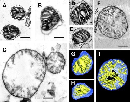 Figure 4. tBid produces no observable changes in mitochondrial ultrastructure, whereas Ca2+ causes swelling of the matrix. Shown are representative images from thin (∼70 nm) sections using conventional electron microscopy. Before fixation, Xenopus mitochondria (0.3 mg/ml protein) were incubated for 30 min at 22°C in import buffer with (A) 10 μg/ml tBid, (B) buffer only, or (C) 1 mM CaCl2. No significant difference between tBid-treated and control mitochondria could be observed (A and B). Only the calcium treatment led to matrix swelling (C). No breaks in outer membranes could be seen; even after calcium-induced swelling, the outer membranes apparently stay intact. Electron tomography also shows that tBid produces no significant structural alterations in mitochondria, whereas Ca2+ causes matrix swelling. D–F show cross-sections (2.3-nm thickness) through the middle of electron tomographic reconstructions of semi-thick (∼500 nm) sections of mitochondria treated with 10 μg/ml tBid (D), buffer (E), or 1 mM CaCl2 (F). Surface-rendered volumes of the same three mitochondria reconstructed for D–F are shown in G–I. Here, the outer membrane is shown in dark blue, the inner boundary membrane in light blue, and the cristal membranes in yellow. Bars, 250 nm.