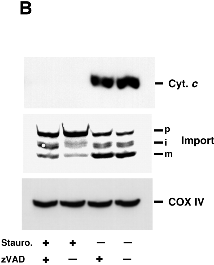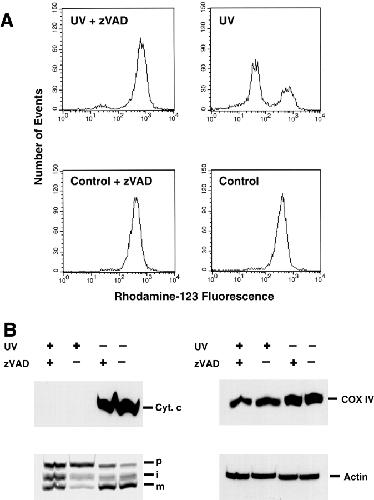 Figure 7. When caspases are inhibited, UV-irradiated HeLa cells display a complete loss of mitochondrial cytochrome c, but retain mitochondrial import function. (A) Loss of ΔΨm in apoptotic cells is blocked by caspase inhibition. HeLa cells were exposed to 180 mJ/cm2 UVC light and further cultured for 8 h in medium with or without 100 μM zVAD-fmk as indicated. After this time, >50% of UV-treated cells showed an apoptotic phenotype in the absence of zVAD-fmk. Cells were harvested, and rhodamine-123 retention was measured by flow cytometry (10,000 events shown without gating). In the presence of zVAD-fmk, apoptotic cells retain ΔΨm. (B) Mitochondrial import competence is retained in the presence of zVAD-fmk. After flow cytometric analysis (A), the cells were permeabilized with digitonin and analyzed for cytochrome c content and import-competence. Cell pellets were extracted with NP-40 lysis buffer (150 mM NaCl, 1% NP-40, and 50 mM Tris-Cl, pH 8.0), and the protein content of the extract was determined by the Bradford assay. Finally, 50 μg of protein from each sample was subjected to SDS-PAGE and Western blotting. Quantitative analysis by phosphorimaging revealed 82 and 17% imported protein in the UV-treated samples with or without zVAD, respectively. Control samples gave 100 and 89% import, respectively (the control sample with zVAD was taken as 100%). Blots were stripped and reprobed with antibodies to COX-IV and actin to demonstrate equal gel loading.