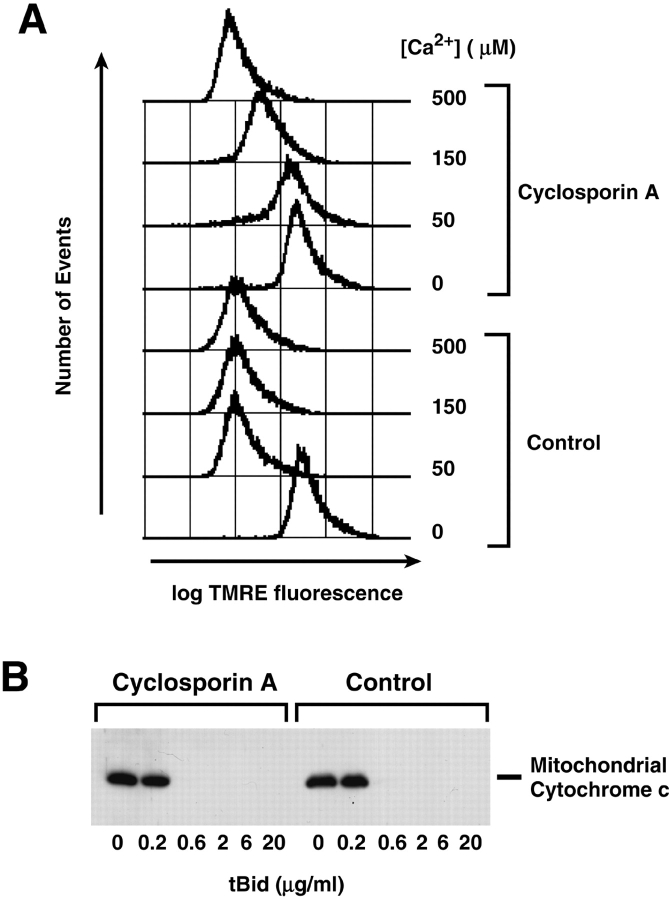 Figure 3. Cyclosporin A blocks PT in Xenopus mitochondria, but has no effect on tBid-induced cytochrome c release. (A) Xenopus mitochondria were preincubated in PT buffer with or without 10 μM cyclosporin A (A) for 15 min at 22°C, and CaCl2 was added at the indicated concentrations. After 30 min, TMRE retention was measured by flow cytometry. (B) The lack of effect of cyclosporin A on tBid-induced cytochrome c release. Xenopus mitochondria were preincubated in PT buffer with or without 10 μM cyclosporin A for 15 min at 22°C, and tBid was added at the indicated concentrations. After 30 min at 22°C, the mitochondria were reisolated and their cytochrome c content was analyzed by Western blotting.