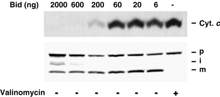 Figure 6. Bid releases cytochrome c from mitochondria in permeabilized HeLa cells without disruption of membrane potential or protein import. Permeabilized HeLa cells (2 × 105) were incubated in 100 μl of import buffer with the indicated amounts of Bid for 30 min at 22°C. An aliquot was spun down to analyze cytochrome c content, and the remaining sample was used to assess import competence. Cell pellets were extracted with NP-40 lysis buffer and analyzed as described in Fig. 7.