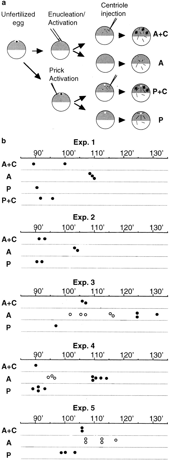 Although maturation/M phase promoting factor (MPF) can activate autonomously in Xenopus egg cytoplasm, indirect evidence suggests that nuclei and centrosomes may focus activation within the cell. We have dissected the contribution of these structures to MPF activation in fertilized eggs and in egg fragments containing different combinations of nuclei, centrosomes, and microtubules by following the behavior of Cdc2 (the kinase component of MPF), the regulatory subunit cyclin B, and the activating phosphatase Cdc25. The absence of the entire nucleus-centrosome complex resulted in a marked delay in MPF activation, whereas the absence of the centrosome alone caused a lesser delay. Nocodazole treatment to depolymerize microtubules through first interphase had an effect equivalent to removing the centrosome. Furthermore, microinjection of isolated centrosomes into anucleate eggs promoted MPF activation and advanced the onset of surface contraction waves, which are close indicators of MPF activation and could be triggered by ectopic MPF injection. Finally, we were able to demonstrate stimulation of MPF activation by the nucleus-centriole complex in vitro, as low concentrations of isolated sperm nuclei advanced MPF activation in cycling cytoplasmic extracts. Together these results indicate that nuclei and microtubule asters can independently stimulate MPF activation and that they cooperate to enhance activation locally.