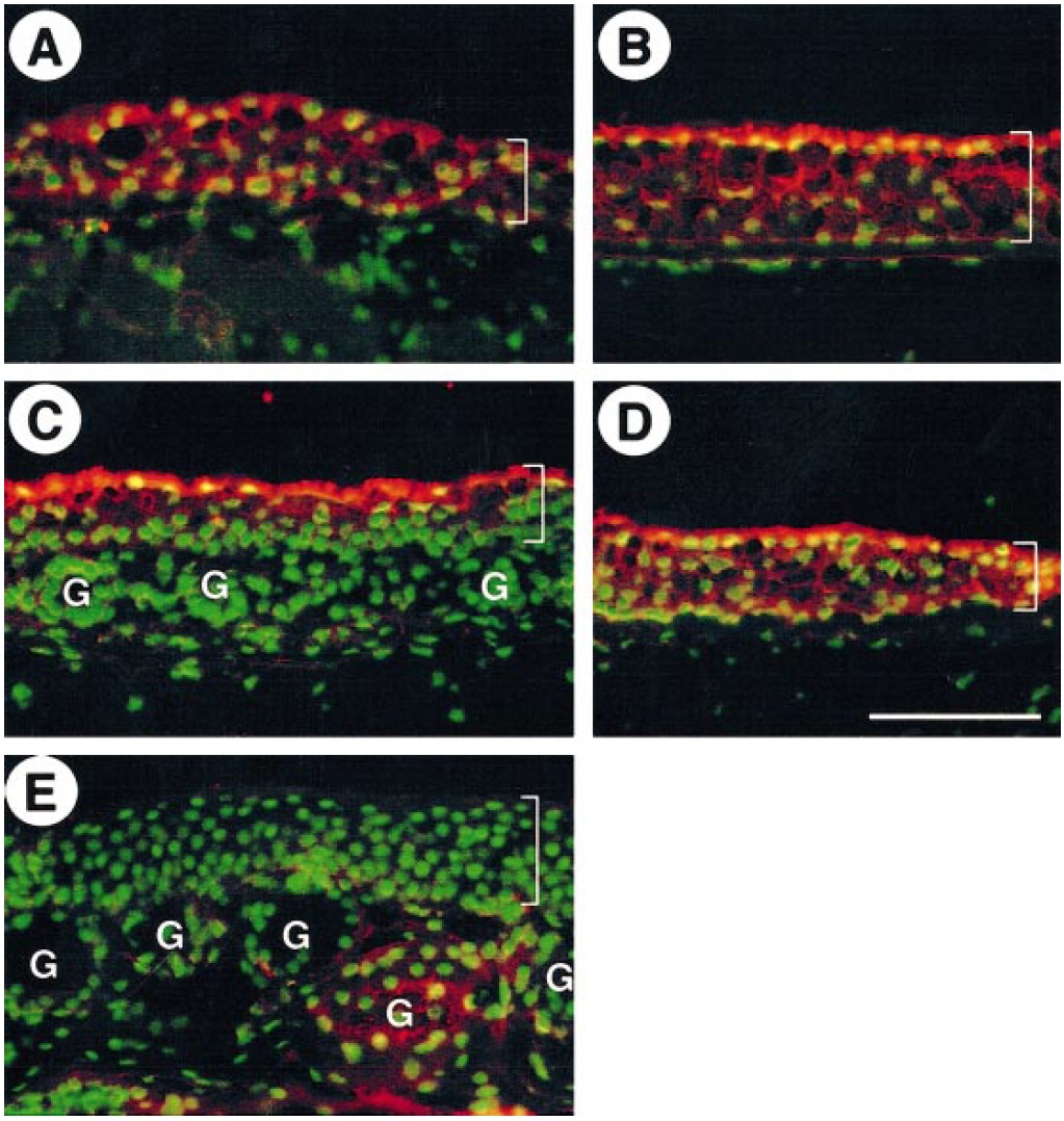 Fig. 2. Immunohistochemistry of the border area between the trunk and tailepidermis at the metamorphic climax stage using the