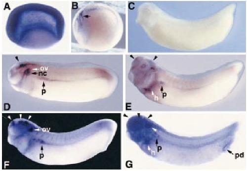 expressed in the brain (arrowhead), neural crest (nc), ventral otic