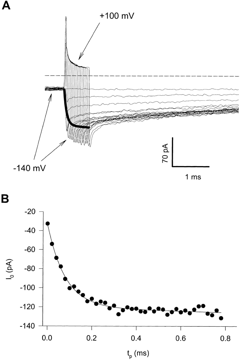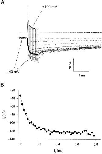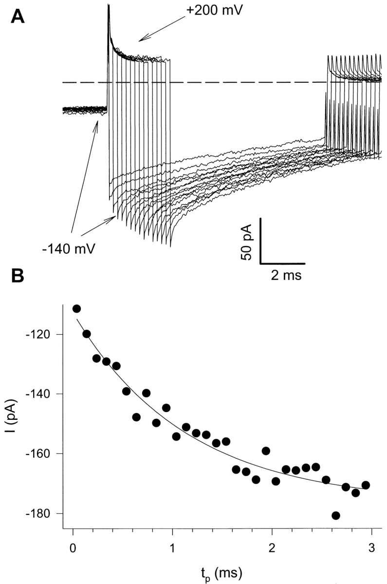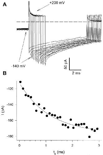 Figure 3. Determination of the slow time constant of CLC-1. (A) A 120-ms pulse to −140 mV is followed by a pulse of varying duration to +200 mV, increasing its duration in 100-μs steps starting from a minimum of 40 μs. The patch is then repolarized to −140 mV for 10 ms. The initial part of the 120-ms pulse to −140 mV is not shown. Only every second trace is shown on the graph. Dashed line represents zero current. (B) Instantaneous currents recorded upon repolarization at −140 mV plotted as a function of the prepulse duration. The fast gate is maximally activated by the prepulse, thus the recorded currents reflect only the slow gate activation. A single exponential fit gives a time constant of 1.1 ms.