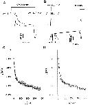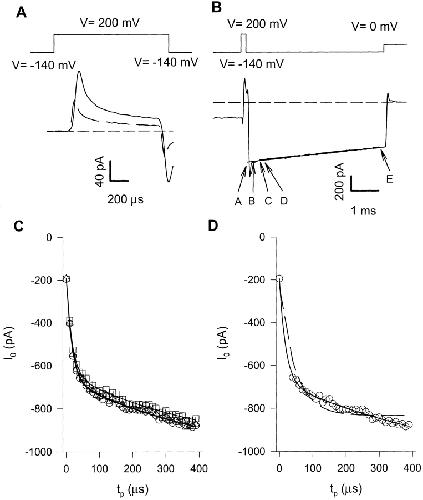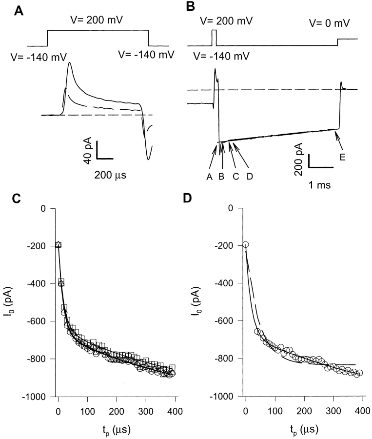 Figure 1. Limitations of the envelope protocols at high voltages. (A) Capacity artifact recorded when stepping from a holding potential of −140 to +200 mV for 1 ms due to a patch of a noninjected oocyte, the patch pipette and the holder (solid line), or from the pipette holder only (dashed line). (B) Typical current recorded with an envelope protocol to +200 mV, with tp = 180 μs. Cursor positions used for the fitting are indicated by arrows: A = 0 (beginning of the repolarization pulse), B = 225 μs, C = 470 μs, D = 610 μs, and E = 4,775 μs. Three single-exponential fits were performed (that were superimposable). In the first (continuous line), the trace was fitted between B and E and extrapolated to A (set 1); in the second (thick dashed line, indistinguishable from the thick continuous line), the fit was done between D and E and extrapolated to C (set 2); in the third (not shown), the trace was fitted between D and E and extrapolated to A (set 3). (C) Initial currents recorded upon repolarization for a whole envelope protocol using set 1 of the cursor positions (○), set 2 (□) or set 3 (▵). The continuous lines are double-exponential fits of the initial currents recorded upon repolarization in all three cases. Only two curves are clearly distinguishable since the traces corresponding to sets 1 and 3 are almost superimposable (and make up the thicker line), while the thinner visible curve corresponds to set 2. The time constants found are: τf(set 1) = 16 μs, τs(set 1) = 467 μs; τf(set 2) = 17 μs, τs(set 2) = 456 μs; τf(set 3) = 17 μs, τs(set 3) = 462 μs. (D) Double (continuous line) and the single (dashed line) exponential fit of the initial currents evaluated with set 1 of cursor positions but without the first three points (those with tp = 10, 20, and 30 μs) to avoid contamination from phenomena of partial charging of the membrane. Clearly, a single-exponential function (dashed line) is inadequate to fit the data. The time constants obtained are τf = 19 μs and τs = 590 μs.