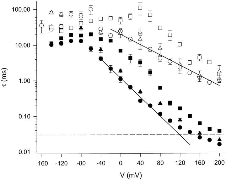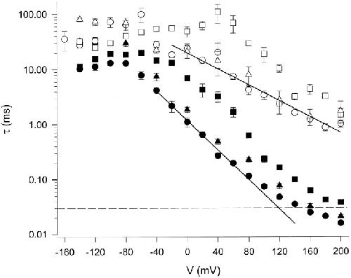 Figure 4. Fast and slow time constants as evaluated with envelope protocols are plotted as a function of voltage for different experimental conditions. Circles, standard conditions; squares, low external chloride; triangles, low internal pH (see materials and methods); filled symbols, fast gate time constants; open symbols, slow gate time constants. Error bars indicate SEM. Continuous lines are exponential fits () of the fast and slow gate time constants in standard conditions yielding activation gating charges zfstandard = −0.79 and zsstandard = −0.42. Similar analysis was performed for low chloride and low pH also, but the fits are not shown. The dashed horizontal line indicates the limit of 30 μs. Data points below this value were not included in the fitting procedures because of possible limitations caused by a limited voltage clamp rise time (see materials and methods for details).
