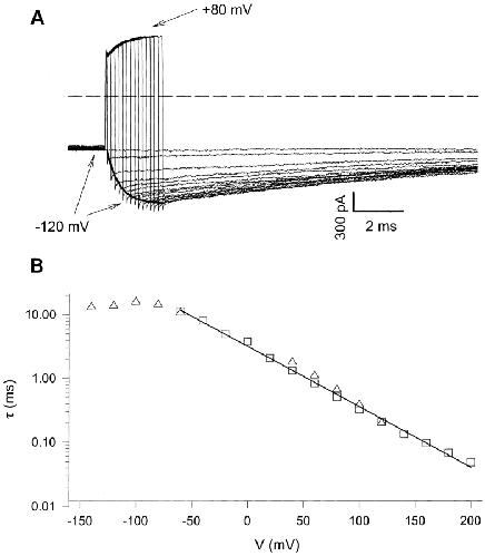 Figure 5. Evaluation of the fast gate time constant of CLC-0 with envelope protocols. (A) A 120-ms pulse to −120 mV followed by a pulse of varying duration to +80 mV is applied to the patch, increasing its duration in 80-μs steps. The patch is then hyperpolarized to −120 mV for 18 ms. The thick line is the single exponential fit of the initial values recorded upon repolarization. Its intercept with the current-trace reflects the best estimate of the initial current recorded upon repolarization. The downward “peak” of the individual traces is caused by the capacitive transient and thus does not faithfully reflect the ionic current flowing through the open channels (see also Fig. 1 B). The initial part of the 120-ms pulse to −120 mV is not shown. The dashed line represents zero current. (B) Time constants of the fast gate of CLC-0 measured both with envelope protocols (□) and by direct fitting of the current during the activation pulse (▵). The continuous line is a single exponential fit () of the fast gate time constants that yields zfCLC-0 = −0.55.