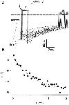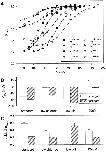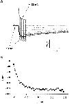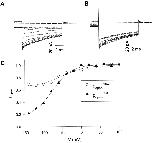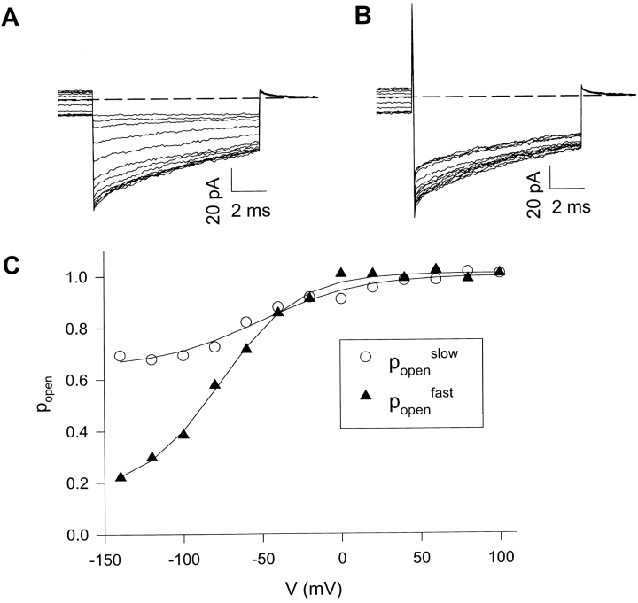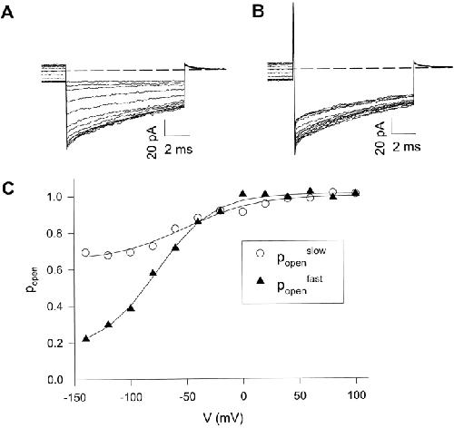 Figure 6. Separation of fast and slow gate open probabilities. (A) Currents recorded when 200-ms pulses of increasing voltages from −140 to +100 mV are followed by a 10-ms repolarization to −140 mV. The initial part of the 200-ms pulse to −140 mV is not shown. Dashed line represents zero current. (B) Currents recorded when 200-ms pulses of increasing voltages from −140 to +100 mV are followed by a short 200-μs pulse to +200 mV, and then by a 10-ms repolarization to −140 mV. The initial part of the 120-ms pulse to −140 mV is not shown. Dashed line represents zero current. (C) Open probabilities for the fast (▴) and slow (○) gating processes. Continuous lines are the fits of the open probabilities with . The obtained values are: P0f = 0.16, V1/2f = −77 mV; and zf = 1.03, P0s = 0.65, V1/2s = −51 mV, and zs = 0.81.