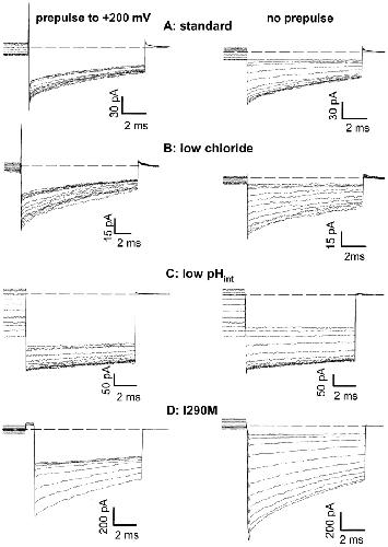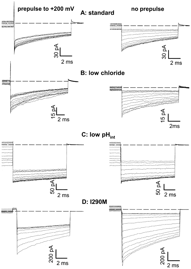 Figure 8. Currents evoked with protocols similar to those described in Fig. 6A and Fig. B, in different experimental conditions. The stimulation protocol in the left column is a 200-ms pulse at voltages varying from −140 to +100 mV in 20-mV steps, followed by a short activating pulse at +200 mV whose duration is sufficient to fully activate the fast gate in the different conditions, and then followed by a 10-ms repolarization to −140 mV. The stimulation protocol in the right column is the same, except that there is no activating pulse at +200 mV. The initial part of the 200-ms pulse to the varying potential is not shown. Dashed line represents zero current. (A) Standard conditions. (B) Low external chloride solution, 20 mM. (C) Low internal pH 6.5. (D) Dominant myotonia inducing mutation, I290M.