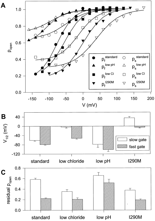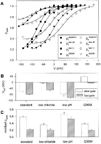Figure 9. Fast and slow gate open probabilities in different experimental conditions. (A) Boltzmann fits (continuous lines) of the mean values of the fast (filled symbols) and (empty symbols) slow gating process open probabilities in different conditions. Circles, standard solution; squares, low extracellular chloride; triangles, low intracellular pH; inverted triangles, I290M mutation. (B) Half activation potentials for the fast and slow gate in the different experimental conditions described above. (C) Residual open probability at most negative voltages for the fast and slow gate in the different experimental conditions described above. Shaded histograms relative to fast gate parameters and empty histograms relative to slow gate parameters.