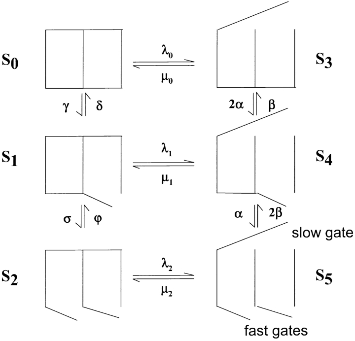 Figure 7. Double-barreled model for CLC-1. Channel opening is governed by two types of gates, one common pore gate (slow gate) and two protopore gates (fast gates). States S0–S2 are nonconducting, because the slow gate is closed. State S3 is nonconducting because both fast gates are closed. The conductance of state S5 is twice that of S4. The fast gates are independent of each other with the slow gate open, whereas all other transition rates depend on the channel state.
