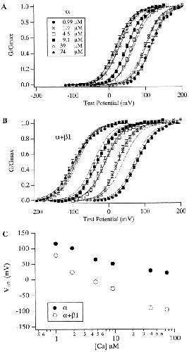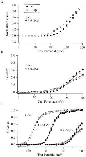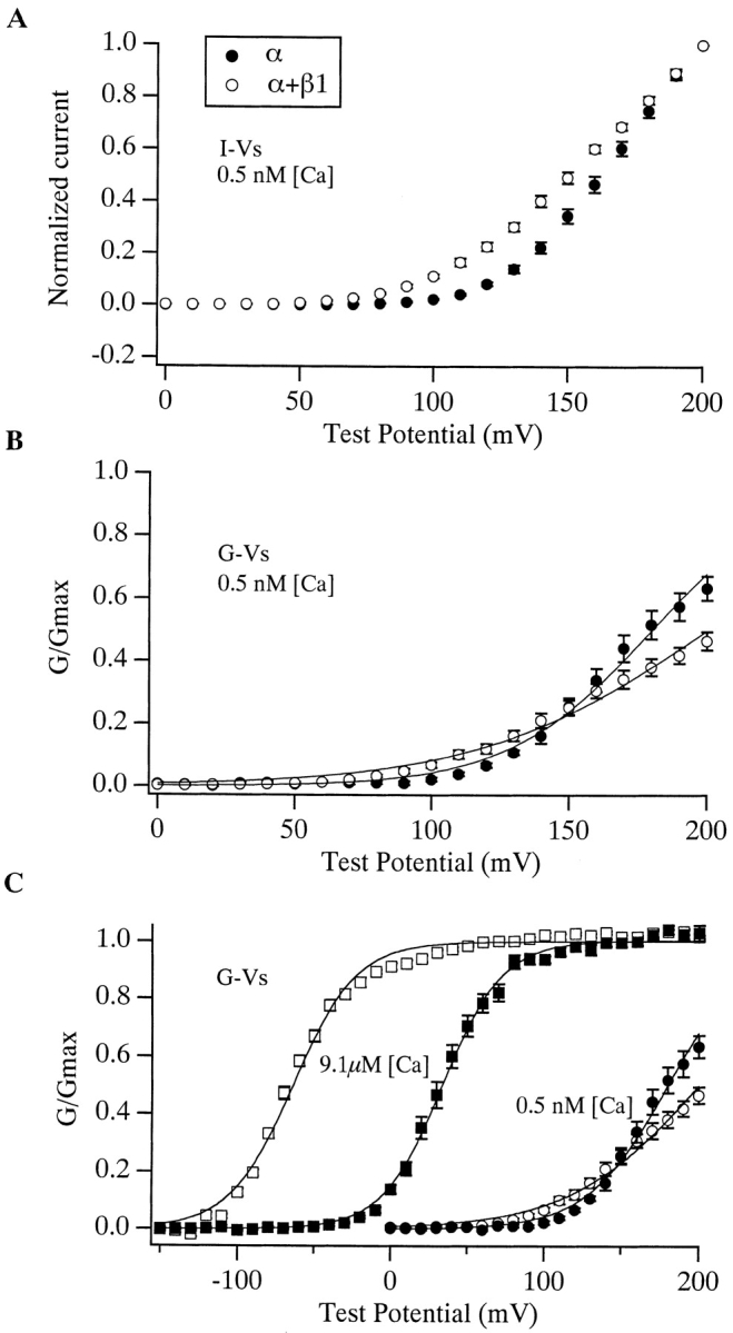 Figure 7. Effects of the β1 subunit at subnanomolar [Ca2+]. (A) Current–voltage curves for mSloα (•, n = 11) and mSloα + β1 (○, n = 8) determined from patches superfused with a solution buffered to 0.5 nM [Ca2+]. Each current measurement was made at the end of a 50-ms voltage step to the indicated test voltage. Each curve has been normalized to their values at +200 mV. (B) G-V relations were determined as described in the text from the same data as used to generate the I-V plots in A. Smooth curves represent Boltzmann fits. Parameters of the fits are: mSloα V1/2 = 180 mV, z = 0.98, mSloα + β1 V1/2 = 200 mV, z = 0.61. (C) In each experiment, data was acquired at both 9.1 μM (squares) and 0.5 nM [Ca2+] (circles). G-V plots for both concentrations are shown in C. In A–C, error bars indicate SEM.