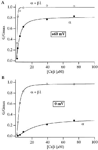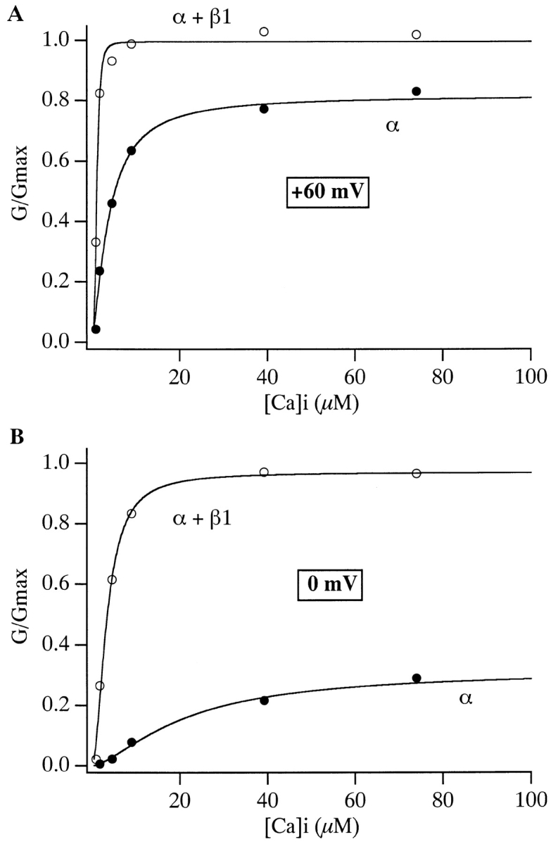 Figure 2. Ca2+ dose–response curves for mSloα (•) and mSloα + β1 (○) at (A) +60 mV and (B) 0 mV. Data are from those shown in Fig. 1A and Fig. B. Smooth curves represent fits to the Hill equation G/Gmax = Amplitude/{1 + (Kd/[Ca])n}. Fit parameters are as follows: +60 mV mSloα Kd = 3.84 μM, n = 1.5, Amplitude = 0.82; mSloα + β1 Kd = 1.20 μM, n = 3.5, Amplitude = 1.00: 0 mV mSloα Kd = 32.8 μM, n = 1.3, Amplitude = 0.39; mSloα + β1 Kd = 3.43 μM, n = 1.9, Amplitude = 0.97.