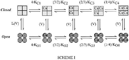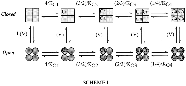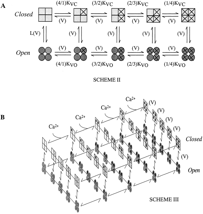Figure 10. (A) Scheme II, allosteric model of Horrigan et al. 1999. Horizontal transitions represent voltage sensor motion in each of four subunits with KVC and KVO representing the forward microscopic equilibrium constants for these transitions for the closed and open channel, respectively. Vertical transitions represent the conformation change by which the channel opens. All transitions are hypothesized to be voltage dependent. (B) Allosteric model to account for both the Ca2+- and voltage-dependent properties of mSlo gating. This model represents the simplest combination of Schemes I and II. Transitions along the long horizontal axis represent Ca2+ binding and unbinding. Transitions along the short horizontal axis represent voltage sensor movement. Transitions from top to bottom represent channel opening. Implicit in this scheme and are the assumptions that voltage sensors and Ca2+ binding sites in each subunit are identical and act independently, and that voltage-sensor movement does not directly influence Ca2+ binding, and vice versa.