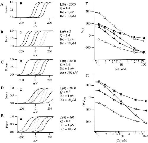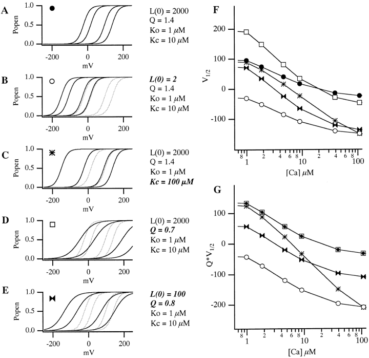 Figure 4. Effects of changes in various aspects of gating according to the voltage-dependent MWC model. (A) Control G-V simulations, with (from left to right) 0, 1, 10, and 100 μM [Ca2+]. Model parameters are as indicated. (B) Simulated effect of decreasing L(0). (C) Simulated effect of decreasing KC. (D) Simulated effect of decreasing Q. (E) Simulated effect of decreasing both Q and L(0). In A–E, the control curves of A are shown in gray for comparison. (F) Simulated V1/2 vs. [Ca2+] and (G) Q*V1/2 vs. [Ca2+] plots for the various conditions shown in A–E. Symbols are as indicated in A–E. Notice in G that only when the actual affinity of the model for Ca2+ is altered does the Q*V1/2 vs. [Ca2+] plot change shape.