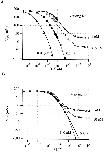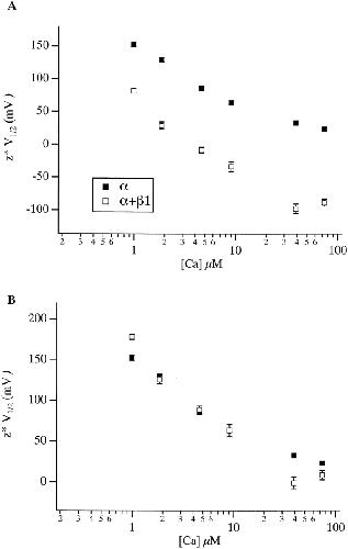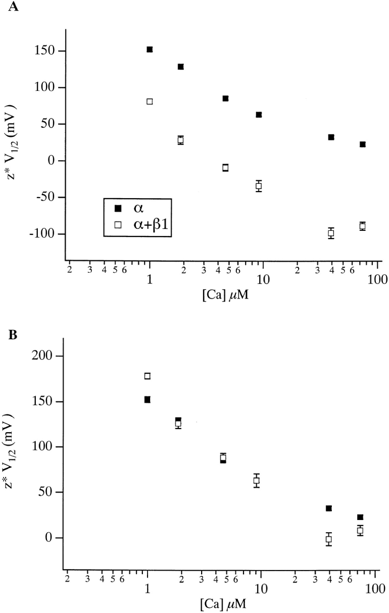 Figure 5. (A) z*V1/2 vs. [Ca2+] plots for mSloα (▪) and mSloα + β1 (□). Each point represents the product of z and V1/2 values listed in Table . In B, the mSloα + β1 curve has been shifted vertically so that the two curves overlap at 9.1 μM. Errors bars indicate SEM and are often smaller than the plot symbols.