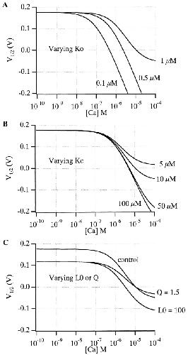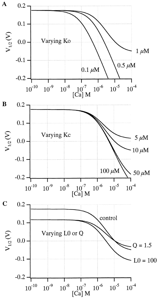 Figure 8. The [Ca2+] at which the voltage-dependent MWC model's V1/2 begins to shift is determined primarily by its affinity in the open conformation. (A) V1/2 vs. [Ca2+] plots calculated from with L(0) = 1,000, Q = 1.0, KC = 10 μM, and KO varying as indicated. (B) V1/2 vs. [Ca2+] plots determined from with L(0) = 1,000, Q = 1.0, KO = 1 μM, and KC varying as indicated. (C) V1/2 vs. [Ca2+] plots determined from with KO = 1 μM and KC = 10 μM, and L(0) or Q as above, or varying as indicated.