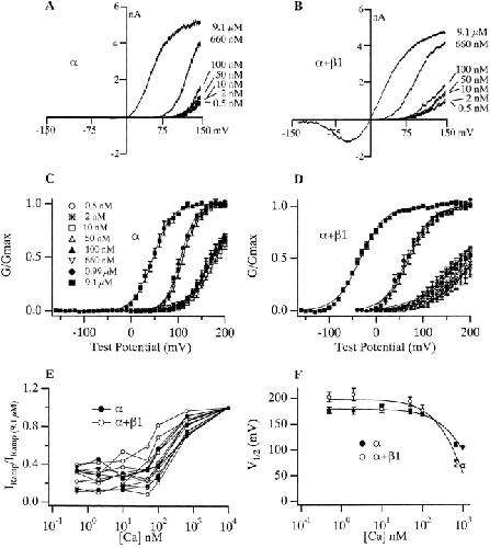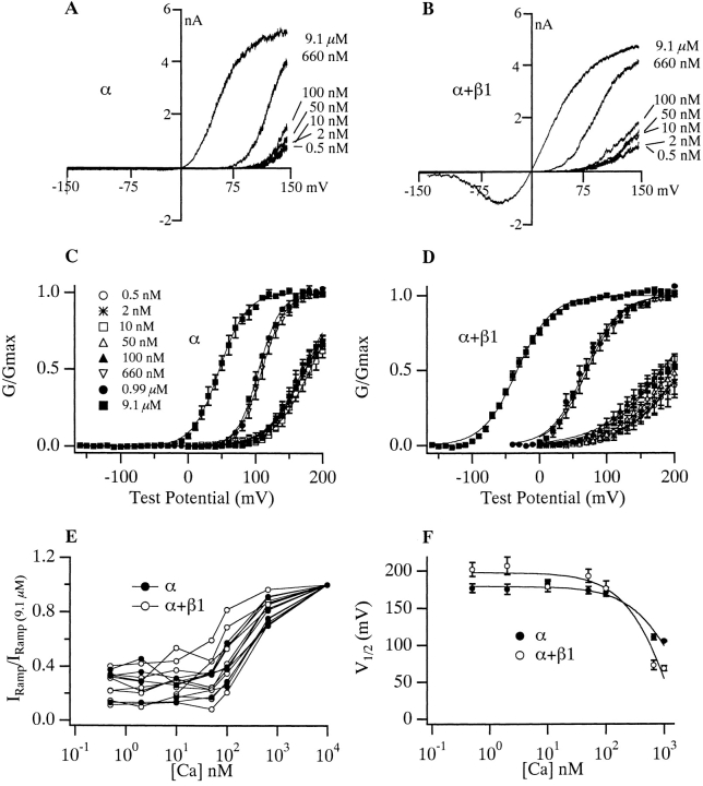 Figure 9. [Ca2+]critical changes very little with β1 coexpression. (A and B) Current traces recorded from macropatches in response to 400-ms ramps from −150 to +150 mV at the indicated [Ca2+] for mSloα (A) and mSloα + β1 (B). All traces in A are from the same patch, as are all traces in B. In E, current amplitude at +150 mV recorded with each [Ca2+] relative to that recorded at 9.1 μM are plotted as a function of [Ca2+]. Plots from 6 mSloα (•) and 11 mSloα + β1 (○) experiments are shown. (C and D) G-V relations determined as described with reference to Fig. 7 B for mSloα (C) and mSloα + β1 (D). [Ca2+] are as indicated. Each curve represents the average of between 2 and 11 experiments as indicated in Table . Each curve has been fitted with a Boltzmann function with the following parameters, in order of increasing [Ca2+]. mSloα V1/2 (mV) = 177, 176, 182, 174, 171, 110, 105, and 47; z = 0.90, 0.88, 0.93, 0.94, 0.93, 1.47, 1.57, and 1.28; mSloα + β1 V1/2 (mV) = 212, 211, 181, 197, 181, 71, 68, and −33; z = 0.62, 0.60, 0.61, 0.62, 0.55, 1.00, 1.00, and 0.98. In F are shown V1/2 vs. [Ca2+] plots for mSloα (•) and mSloα + β1 (○). Each point represents the mean of between 2 and 11 experiments, as indicated in Table . Error bars indicate SEM. Smooth curves represent fits to . For the fits, the Q parameter was constrained to the mean value from analysis of all of our 0.5 nM G-V data. Fit parameters were as follows: mSloα L(0) = 1,034, Q = 0.99, KO = 0.84 μM; mSloα + β1 L(0) = 141, Q = 0.64, KO = 0.68 μM.