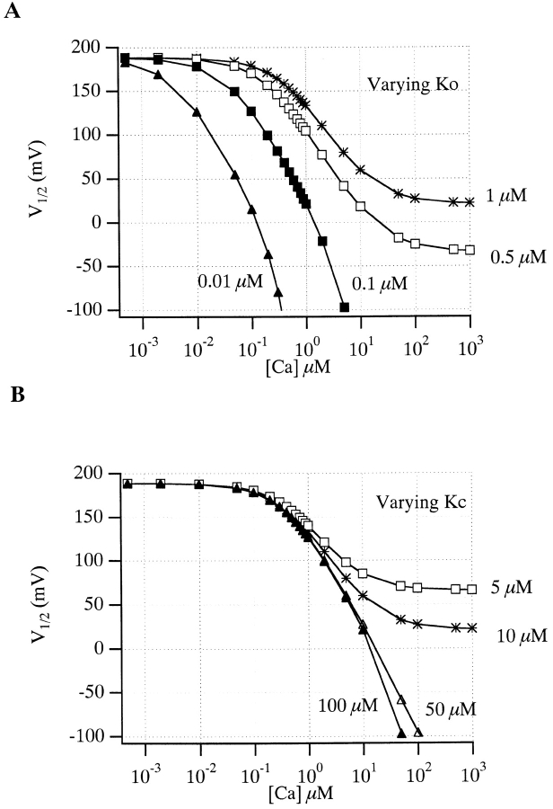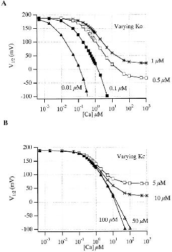 Figure 11. Simulations that demonstrate that [Ca2+]critical for Scheme III, as for Scheme I, depend primarily on the affinity of the model channel when it is open. (A) 50-state-model V1/2 vs. [Ca2+] plots as a function of KO. A series of G-V relations were simulated with at [Ca2+] ranging from 0 to 1,000 μM. V1/2 for each curve was then plotted as a function of [Ca2+]. KO was varied as indicated and the simulations were repeated. (B) Simulated V1/2 vs. [Ca2+] plots were generated as in A, except KC rather than KO was varied. Except where indicated, model parameters were: L(0) = 5e5, Q = 0.40, KC = 10 μM, KO = 1 μM, VhC = 135.9, D = 16.7, Z = 0.51.