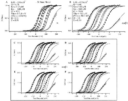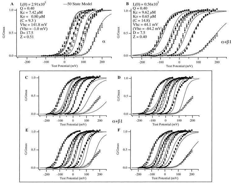Figure 12. 50-state model analysis. (A) mSloα and (B) mSloα + β1 G-V relations over a series of [Ca2+] were fit with as described in the text. The resulting parameters are as indicated on the figure. Those values indicated in parentheses were not parameters of the fit, but rather calculated from the fit parameters. In A, the parameters other than those related to Ca2+ binding were constrained to be within the following ranges, which might reasonably fit the data of Horrigan et al. 1999 at subnanomolar [Ca2+] (Frank Horrigan, personal communication). L(0) 0.25–1 × 106, Q 0.35–0.45, Vhc 135–155, D = 10–20, Z = 0.51–0.59. K0 was constrained to be within 5% of the value estimated from [Ca2+]critical analysis 0.8–0.88 μM and KC was unconstrained. In B, KO was constrained to be within 5% of the value estimated from [Ca2+]critical analysis 0.65–0.72 μM, all other parameters were free to vary. In C–F, various parameters from the fit in B were restored to their values in A. In C, L(0) was restored. In D, the voltage-sensing parameters Q, Z, Vhc, and D were restored. In E, L(0), Q, Z, Vhc, and D were restored. In F, KO and KC were restored. In each panel, G-V relations at the following [Ca2+] are shown: from right to left, 0.0005, 0.99, 1.86, 4.63, 9.1, 39, and 74 μM. Error bars indicate SEM.