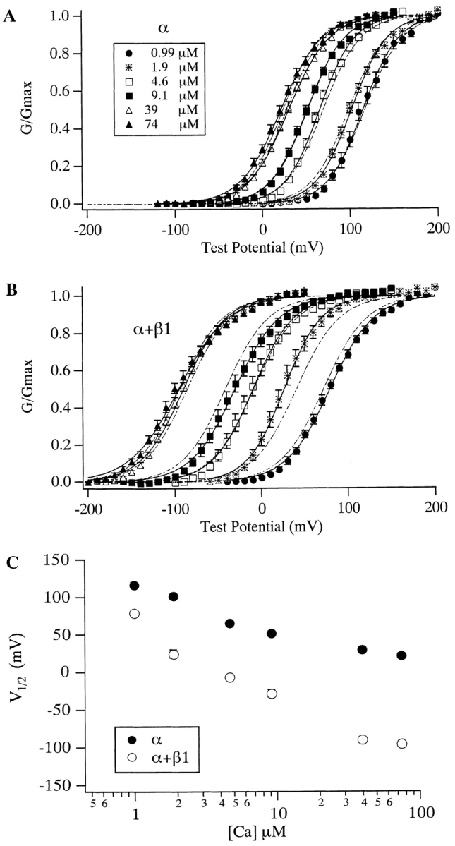 Figure 1. The effects of Ca2+ on the mSlo G-V relation with and without the β1 subunit. G-V relations determined without (A) and with (B) β1 coexpression. [Ca2+] are as indicated in A. Each curve represents the average of between 6 and 15 experiments, as indicated in Table . Error bars represent SEM. Solid curves represent fits to the Boltzmann function GGmax=11+ezFV12−VRT.Parameters of the fits are as follows, in order of increasing [Ca2+]. mSloα V1/2 (mV) = 115.0, 101.9, 65.7, 51.8, 30.4, and 21.2; z = 1.25, 1.25, 1.27, 1.20, 1.10, and 1.09. mSloα + β 1 V1/2 (mV) = 79.2, 26.4, −9.6, −30.6, −90.1, and −95.6; z = 1.01, 1.18, 1.08, 0.99, 1.04, and 0.90. Dashed curves represent fits to . Fit parameters are as follows: mSloα L(0) = 1,263, Q = 1.18, KC = 6.00 μM, KO = 1.24 μM; mSloα + β1 L(0) 281, Q = 1.02, KC = 9.82 μM, KO = 0.82 μM. (C) Plots of V1/2 vs. [Ca2+] for mSloα (•) and mSloα + β1 (○) channels. Data are from Table . Error bars indicate SEM and are often smaller than the plot symbols.