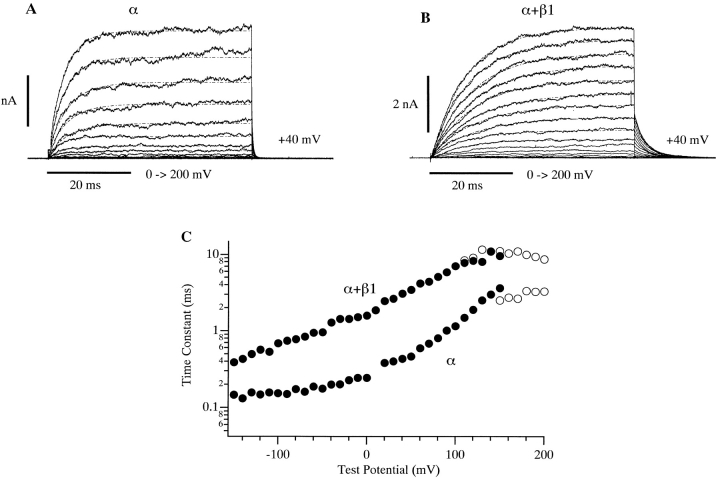 Figure 6. The β1 subunit has effects on mSlo macroscopic current kinetics at subnanomolar [Ca2+]. Shown are families of current traces recorded in the absence (A) and presence (B) of β1. For each trace, the membrane voltage was held at −50 mV and stepped to the indicated voltages. [Ca2+] equaled 0.5 nM. Superimposed on each trace are monoexponential fits. Time constants from these fits are plotted in C (○). Also plotted are deactivation time constants (•) determined from monoexponential fits to currents elicited with a protocol that activated the channels with a depolarizing step, and then deactivated with steps to the indicated potentials (traces not shown).