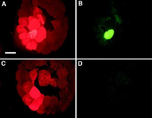 Figure 5. An example of neurobiotin transfer in ventral blastomeres. One ventral blastomere of a normal 64-cell stage embryo was coinjected with neurobiotin and dextran-fluorescein (A–D). The sectioned embryo shows neurobiotin (A and C) and dextran-fluorescein (B and D). More than 10 cells receiving neurobiotin are seen in the animal section (A and B). At least three additional cells that received NB are seen in a different section, vegetal from the injected cell, which is not in this plane of section (D). Bar, 200 μm.