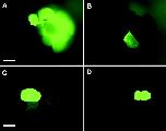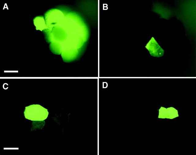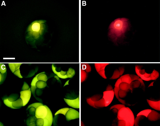 Figure 1. Whole-mount photographs of 16–32-cell stage embryos, coinjected with LY (Mr = 457) and dextran-rhodamine (Mr = 10,000). Dextran is too large to pass through gap junctional channels and serves as a marker for the injected cell and all cells joined to the injected cell by cytoplasmic bridges. A and B show examples of undetectable dye transfer, while C and D show a sample of embryos where LY appears to spread away from the injected cell. Notice, however, that the nonpermeant dextran shows an identical pattern to the LY. Bar, 0.5 mm.