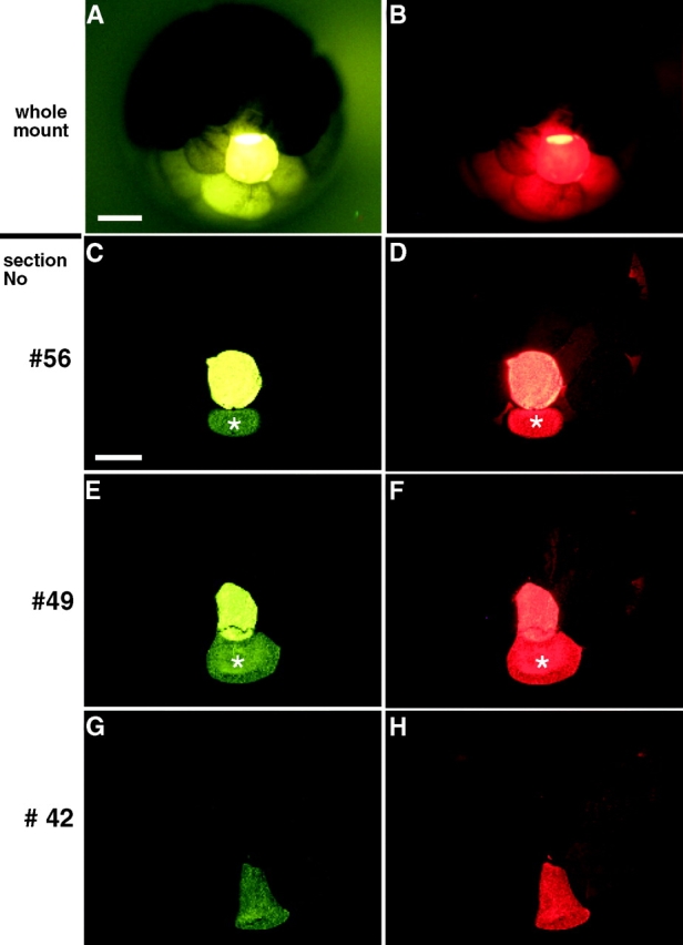 Figure 2. No evidence for junctional transfer of LY was detected in sectioned embryos coinjected with LY and dextran-rhodamine. An embryo in which LY appeared to transfer to adjacent cells (Fig. 2A and Fig. B) was serially sectioned. ∼70 cross sections along the vegetal to animal axis were analyzed. Colocalization of the dyes was always seen, indicating that there was no junctional transfer. (C–F) The dyes were unevenly distributed between the injected cell (very bright green or red cell) and a second cell, which is marked by an asterisk. (G–H) Both dyes remained colocalized in one cell in a plane of section that did not include the injected cell. The presence of dextran-rhodamine in asterisked cells indicates the presence of persistent cytoplasmic bridges with the more brightly stained injected cells. Bars: (A) 250 μm; (C) 200 μm.
