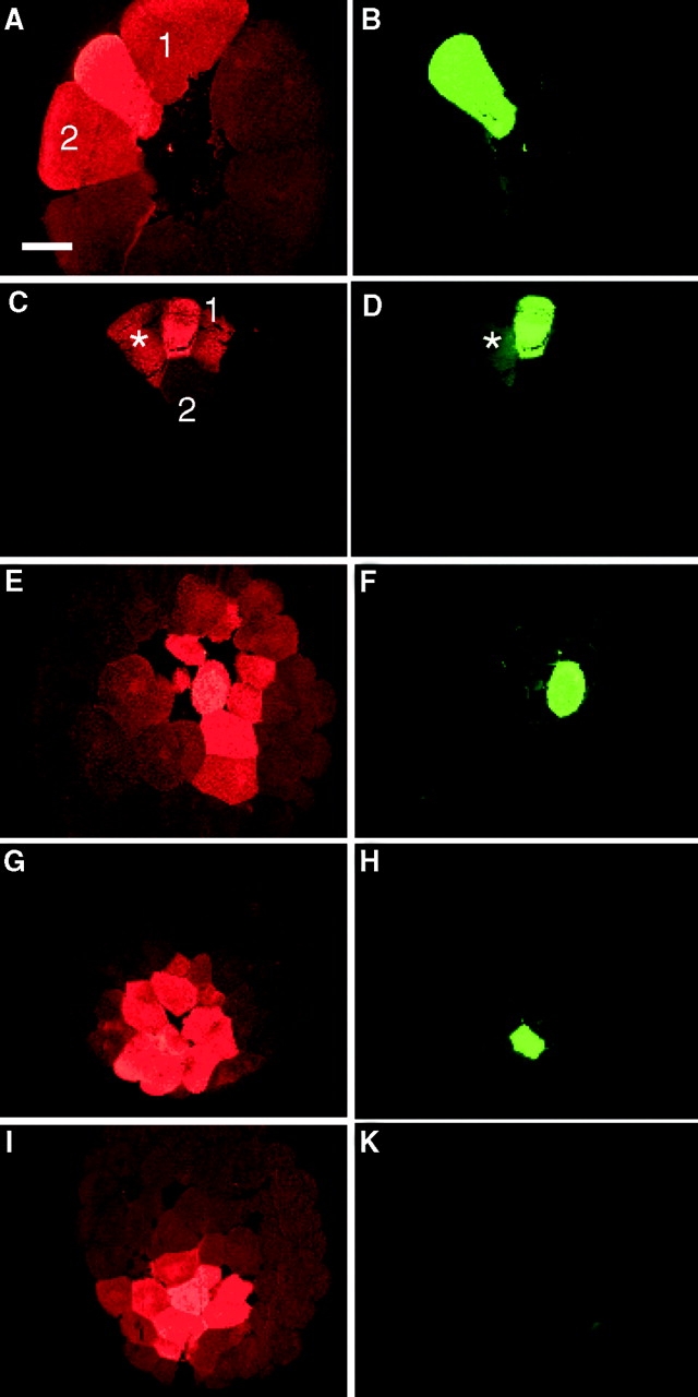 Figure 4. The pattern of neurobiotin (NB) transfer among dorsal blastomeres of normal embryos at the 16-, 32-, 64-, and 128-cell stages. One dorsal blastomere of either 16- (A and B), 32- (C and D), 64- (E and F), and 128- (G–K) cell stage embryos was coinjected with NB and dextran-fluorescein. Sectioned embryos show NB (A, C, E, G, and I) and dextran-fluorescein (B, D, F, H, and K) fluorescence. The 16-cell stage embryo in A, B shows NB transfer into two neighboring animal cells, marked 1 and 2. The injected blastomere of the 32-cell embryo in (C and D) transfers into two animal cells, marked 1 and 2 in C, and is still connected by a cytoplasmic bridge with another animal cell marked with a star in D. The 64-cell stage embryo in E and F shows neurobiotin transfer into at least six neighboring animal cells. The injected blastomere of the 128-cell embryo transfers neurobiotin into >10 animal cells (G and H). Serial sections reveal transfer into more vegetal cells, seen in I, where the injected cell is no longer in the plane of section (K). Bar, 200 μm.