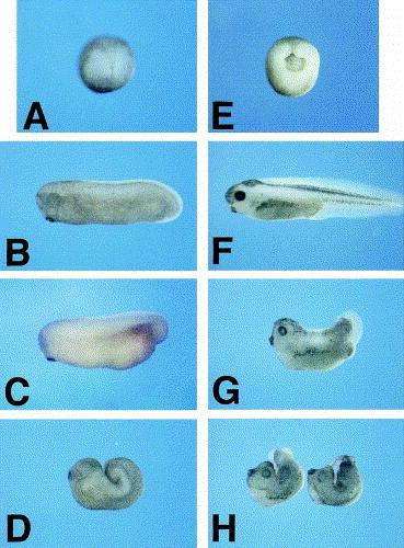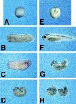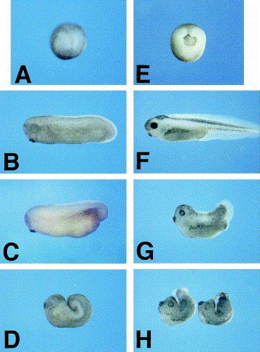 Fig. Effect of Xotx5b overexpression on Xenopus embryos. At stage 13 (A shows a control embryo), injection of Xotx5b mRNA leads to an abnormal blastopore lip (E). Compared to control stage 28 embryos (B), injection of Xotx5b mRNA causes various grades of posterior defects (C,D). Compared to stage 378 controls (F), injected embryos result in weak phenotypes (G) or strong phenotypes (H), depending on the grade of posterior truncation.
