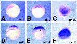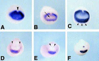 Fig. 2. Expression of Xotx5b during gastrula stages, as detected by whole-mount in situ hybridization. Expression is detected in the dorsal blastopore lip at stage 10 (A, vegetal view), stage 10+ (B, vegetal view), stage 10.5 (arrowhead in C, dorsal view) and stage 11 (D, vegetal view). Starting from stage 10.5, expression is also detected dorsally in the anterior neuroectoderm (C, dorsal view; D, vegetal view). At stage 11.5, expression in the dorsal lip is no longer detectable (arrowhead in E, vegetal view); Xotx5b expression in the anterior neuroectoderm is increased at this stage (E, vegetal view) and at stage 12 (F, frontal view).