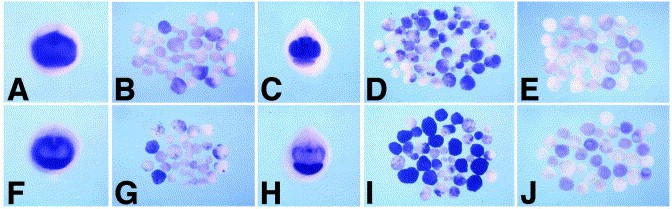 Fig. 9. Reciprocal induction of Xotx5b and Xotx2 assayed in stage 14 and stage 212 animal caps. Xotx5b injected (B,D), Xotx2 injected (G,I) or uninjected control caps (E,J) were grown up to stage 14 (B,G) or stage 212 (D,E,I,J). Stage 14 embryos (A,F) and stage 212 (C,H) embryos are shown in frontal view. Embryos and explants were hybridized to Xotx2 (A) or to Xotx5b (F) probes.