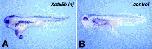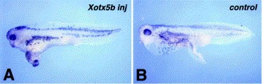 Fig. 10.esults of einsteck transplantation assay with the dorsal blastopore lip of stage 12.5 Xenopus embryos. (A) Xotx5b injected stage 12.5 dorsal lip induces a head structure; (B) uninjected stage 12.5 dorsal lip induces a tail.