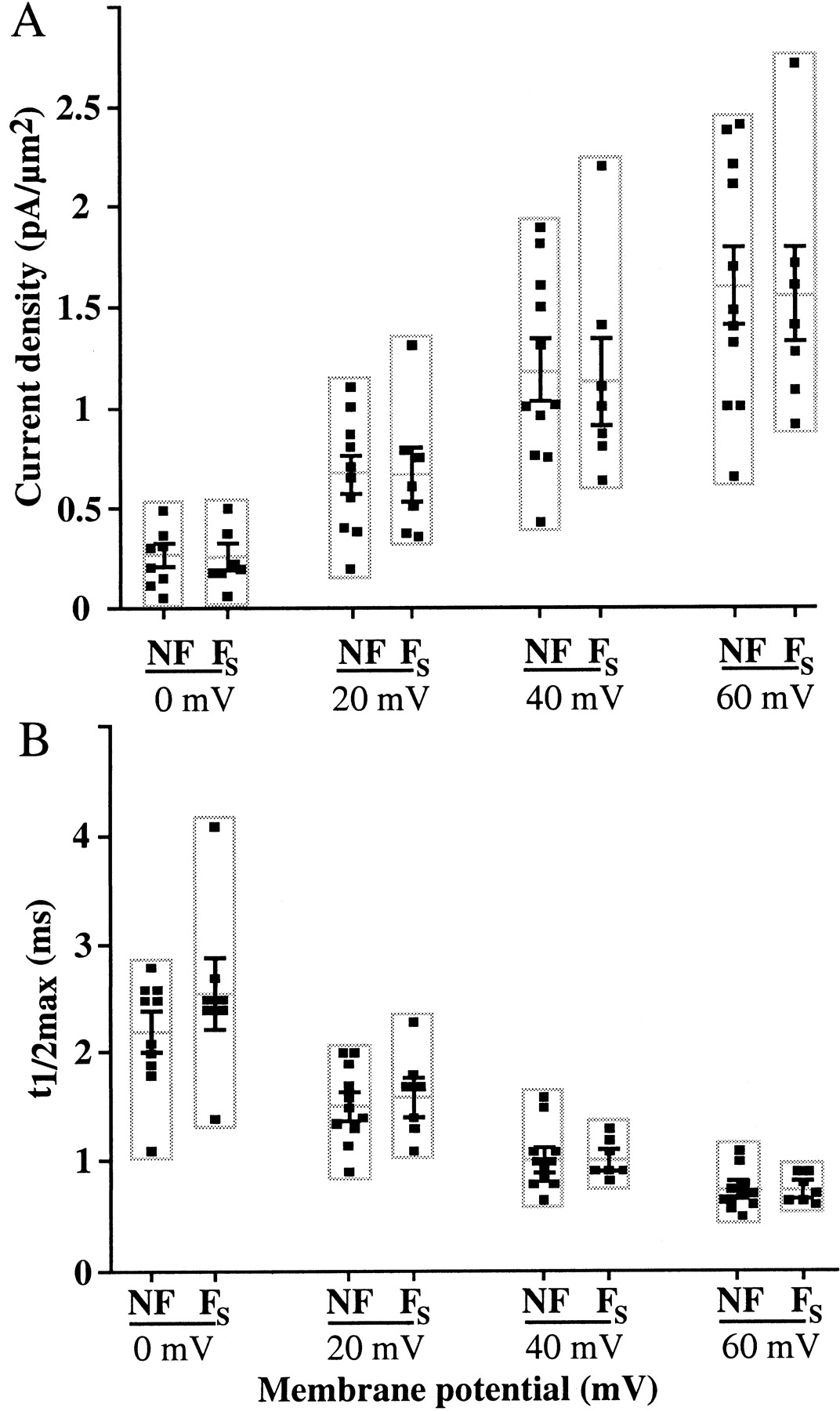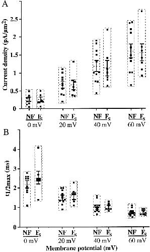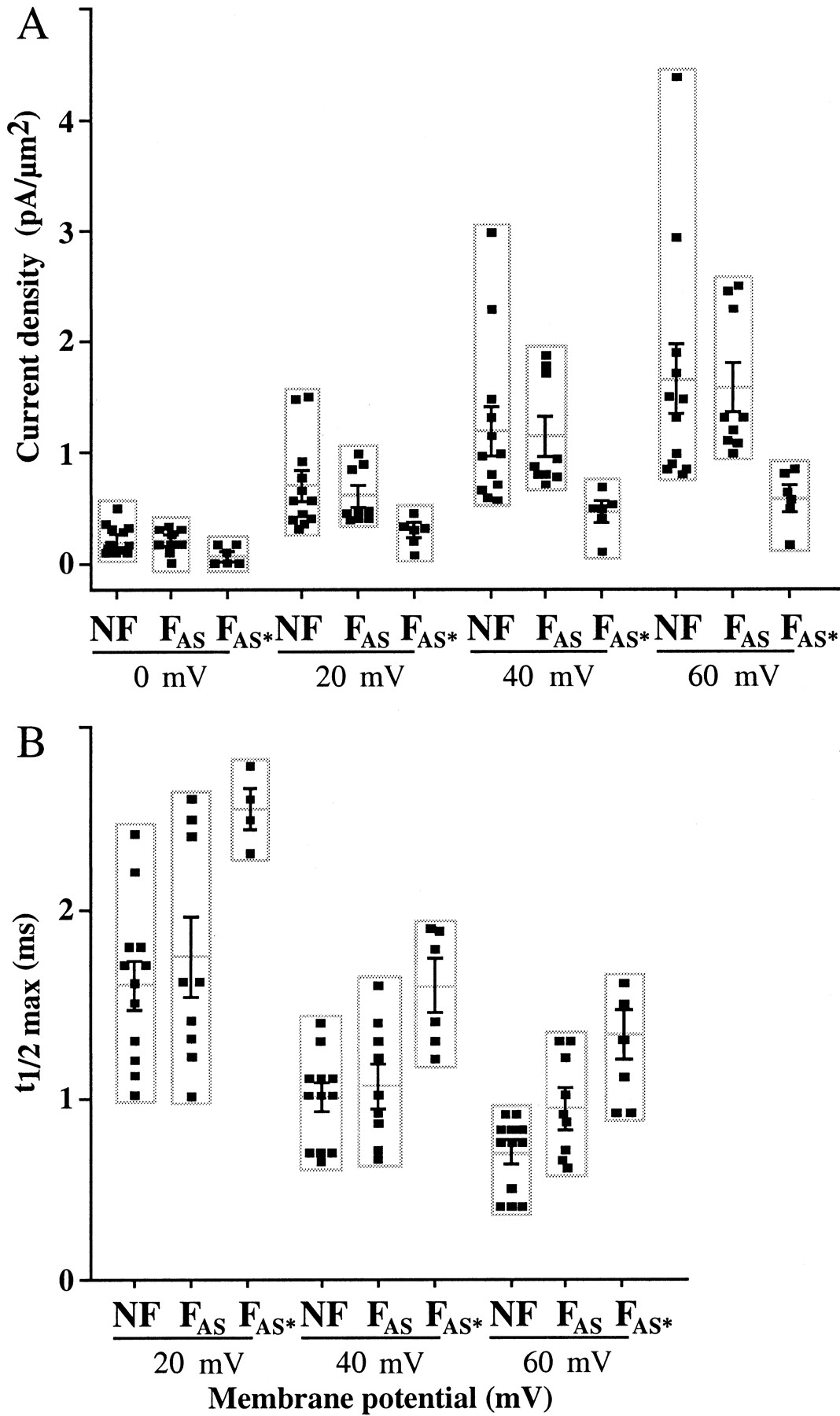 Properties of I Kv in FAS* neurons. Currents were recorded at 18–22 hr in culture. A, Current densities of FAS*neurons are reduced relative to those of NF and FASneurons. FAS* cells show a mean 62 ± 1% decrease in current density at 0 to +60 mV (p < 0.01), whereas FAS cells have currents that are not different from NF controls. The boxes include all measurements from cells at a particular voltage. Horizontal bars indicate the means for these measurements, and vertical barsindicate SEMs. NF, Nonfluorescent;F AS, fluorescent, but unaffected by AS;F AS*, fluorescent, affected by AS. Values were designated FAS* when they exceeded 2 SD from the mean values for NF neurons in the same culture dishand thus in some cases overlap the values for NF neurons recorded in other cultures; n = 27. B, Times to half-activation (t 1/2max) of FAS* neurons are increased relative to those of NF and FAS neurons. FAS* cells show a 66 ± 6% increase in t 1/2max at +20 to +60 mV (p < 0.01), whereas FAS cells have currents that are not different from NF controls. Values at 0 mV are not shown because I Kv is small and slowly activating at this potential in FAS* neurons, and discrimination from noise is ambiguous; n = 27. Noise precluded measurement from two cells at +20 mV.
