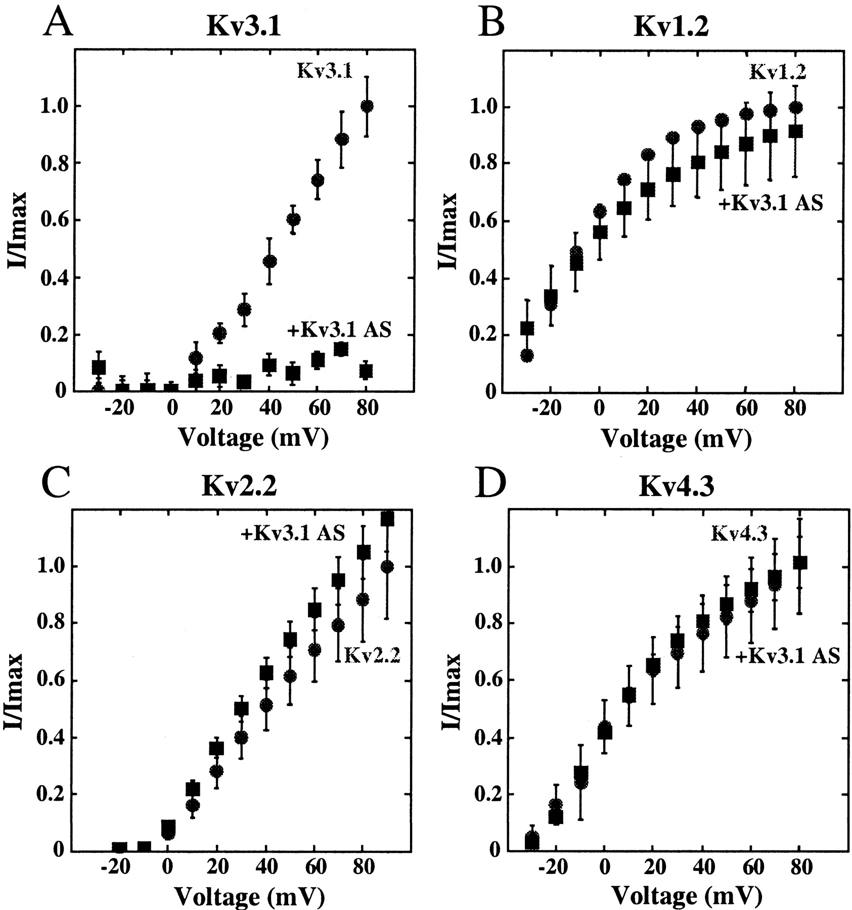 Antisense (AS) RNA to xKv3.1specifically inhibits the current expressed in oocytes injected withxKv3.1 mRNA. Currents were recorded after injection of cRNA encoding xKv genes ± xKv3.1AS. Currents recorded in the presence of AS were normalized to those recorded from oocytes of the same clutch in the absence of AS.A, xKv3.1 AS was injected at a stoichiometry of 4:1 with xKv3.1 RNA. AS decreased the current by 86% without shifting the I–V relation.B–D, xKv3.1 AS had no significant effect on currents encoded by xKv1.1, xKv2.1, orxKv4.3 when mRNA was injected at the same stoichiometry.Circles, xKv RNA alone;squares, xKv RNA plusxKv3.1 AS. n ≥5 for each gene.