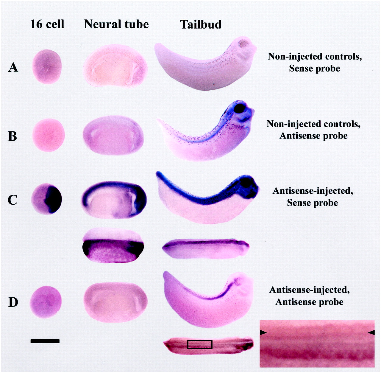 Inhibition of expression of xKv3.1transcripts by antisense RNA injection is visualized by in situ hybridization of whole-mount Xenopus embryos with a xKv3.1-specific antisense probe. A, Sense (S) probe gives no signal in uninjected control embryos. B, AS probe reveals that endogenous xKv3.1 mRNA is present in the spinal cord of control embryos at stage 22 and thereafter (Gurantz et al., 2000).C, S probe labeling of AS-injected embryos demonstrates stability of injected xKv3.1 AS. Signal is observed in 16-cell through stage 30 embryos; dorsal view of another embryo indicates that only the injected side of the embryo (top) contains AS. D, Injection of xKv3.1 AS reduces the endogenous signal detected with the AS probe. Dorsal view of another embryo indicates that reduction of the in situ hybridization signal is restricted to the injected side (top, arrowheads). Area inbox is enlarged at right. For all embryos anterior is to the right and dorsal isup. Scale bar, 1 mm. Black spots on tailbud embryos are melanocytes.