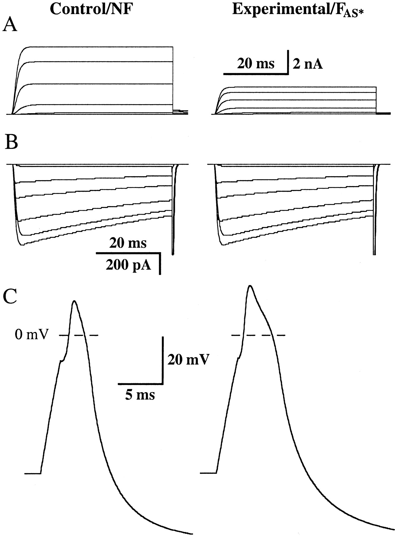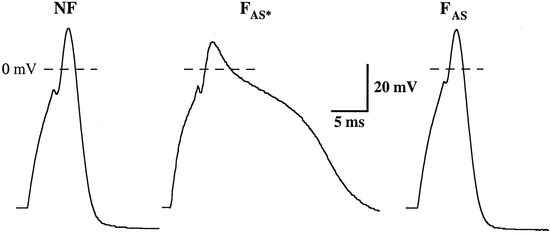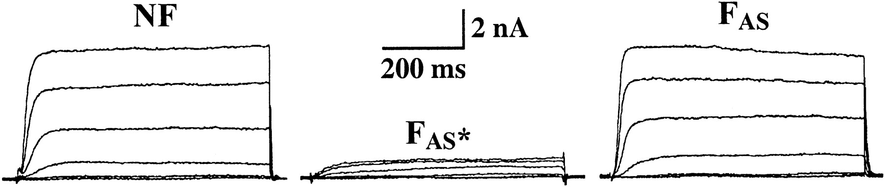 xKv3.1 AS increases action potential duration. The AP of FAS* neurons is longer in duration than that of NF and FAS neurons (p < 0.01), consistent with reduction of the amplitude of I Kv. The records are from three neurons at 1 d in culture; n = 24.
